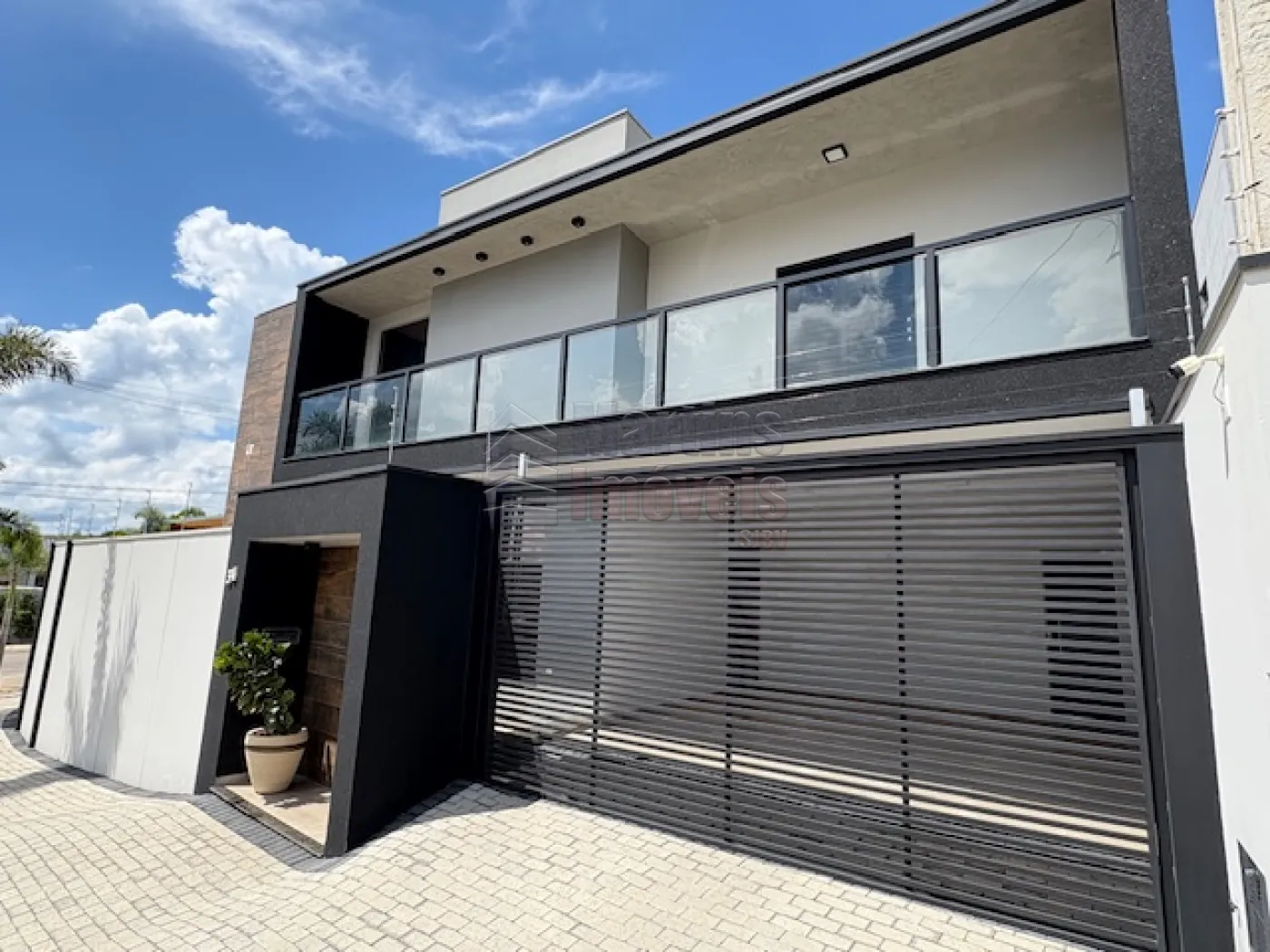 >>> Residência de alto padrão com arquitetura moderna, marcada por linhas retas, fachada em tons de preto e branco com detalhes em vidro e esquadrias pretas.