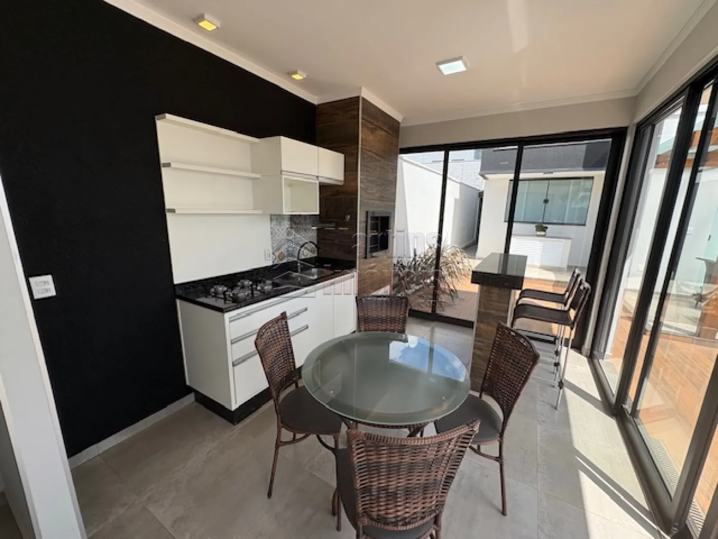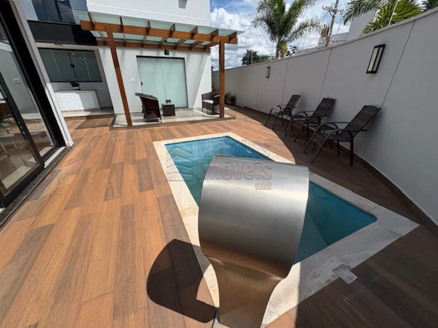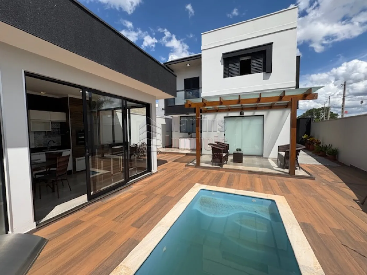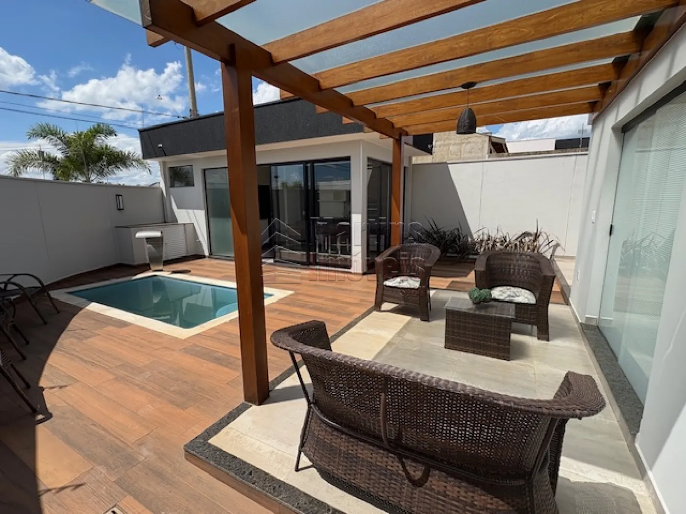>>> Área Externa/Lazer: Deck de madeira com piscina retangular e espaço gourmet coberto por pergolado de madeira, ideal para receber.